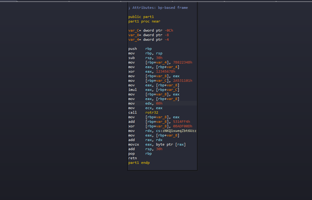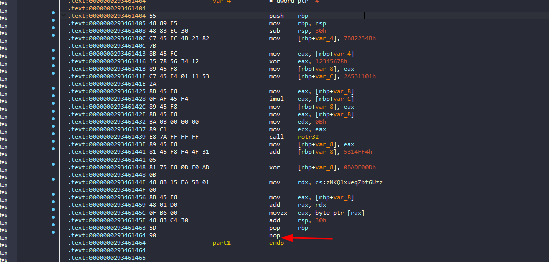 Fortunately, as we observed earlier in IDA, all these parts are contiguous, with the only obstacle being the ret instructions that prevent us from executing them sequentially.