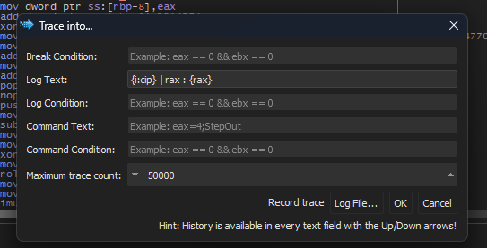 Fortunately, xdbg offers a very powerful feature called tracing, we can trace the execution while logging the the values we need of any register.