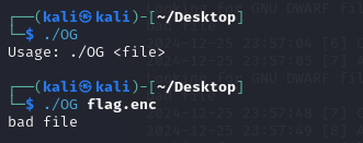 The first thing I did was running the ELF file, it asked for argument so I gave it the flag.enc file but it gave me output “bad file”