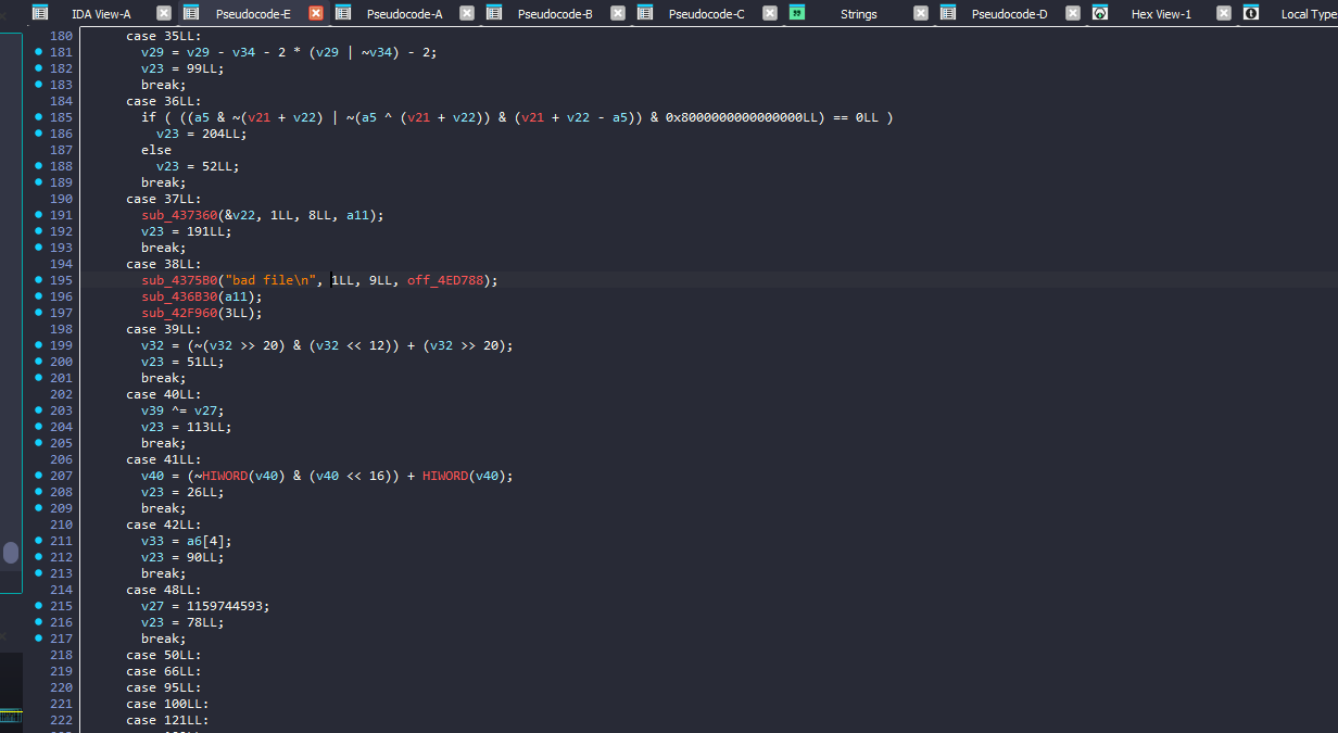 so, I started with searching for the string “bad file” as a first step, and found it inside another big function with a lot of switch cases