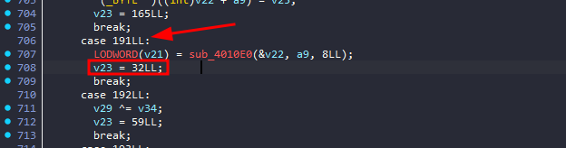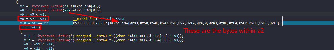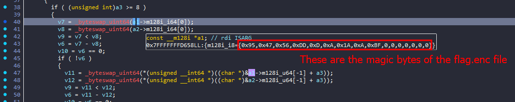 what I noticed here, was that v7 and v8 takes holds the first 8 bytes of a1 and a2, and then v6 is calculated by subtracting v8 from v7 and if v6 is not equal to 0, it will return from this function and eventually leading to the “bad file” output