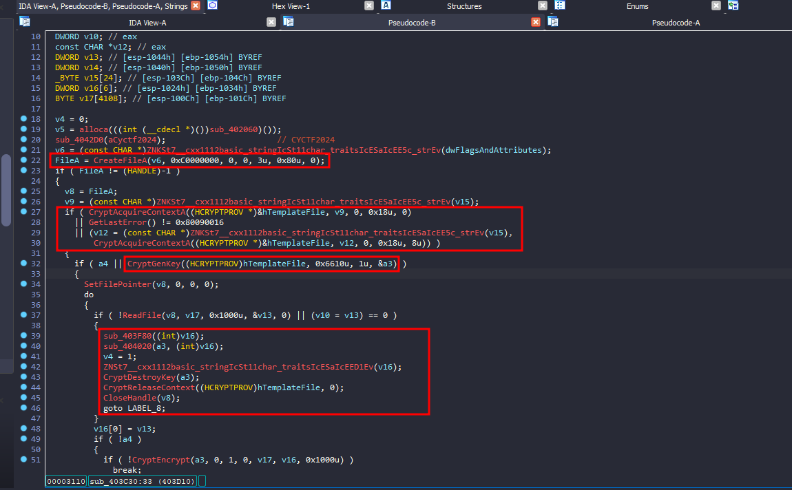 (CreateFileA). - Acquire a cryptographic context