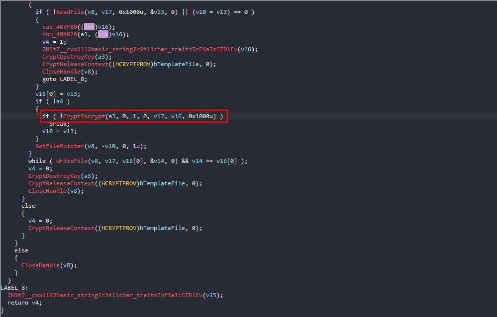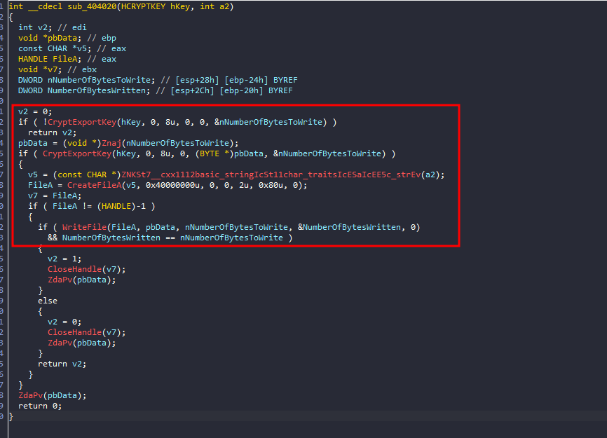 If we dig deeper and take a look at sub_403F80, we will find that it sets a file path for some purpose, and then in sub_404020, it will save the generated encryption key to that file.