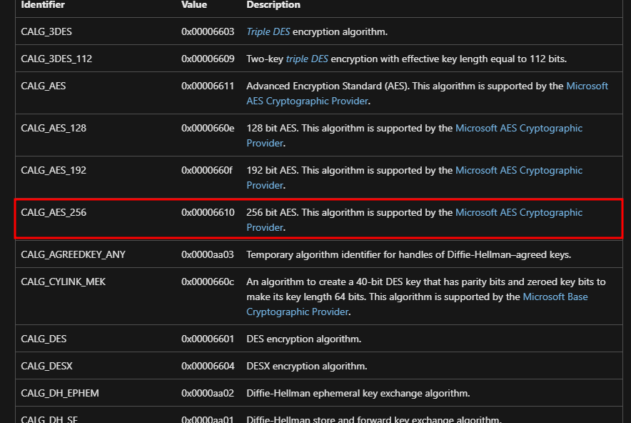 For the CryptGenKey function it takes 0x6610 as an identifier parameter for the crypto algorithm which is AES-256