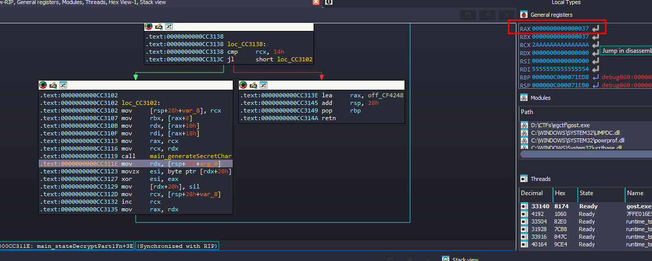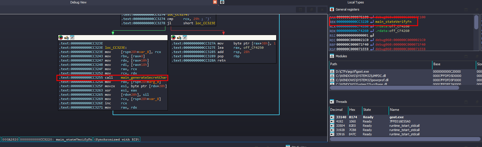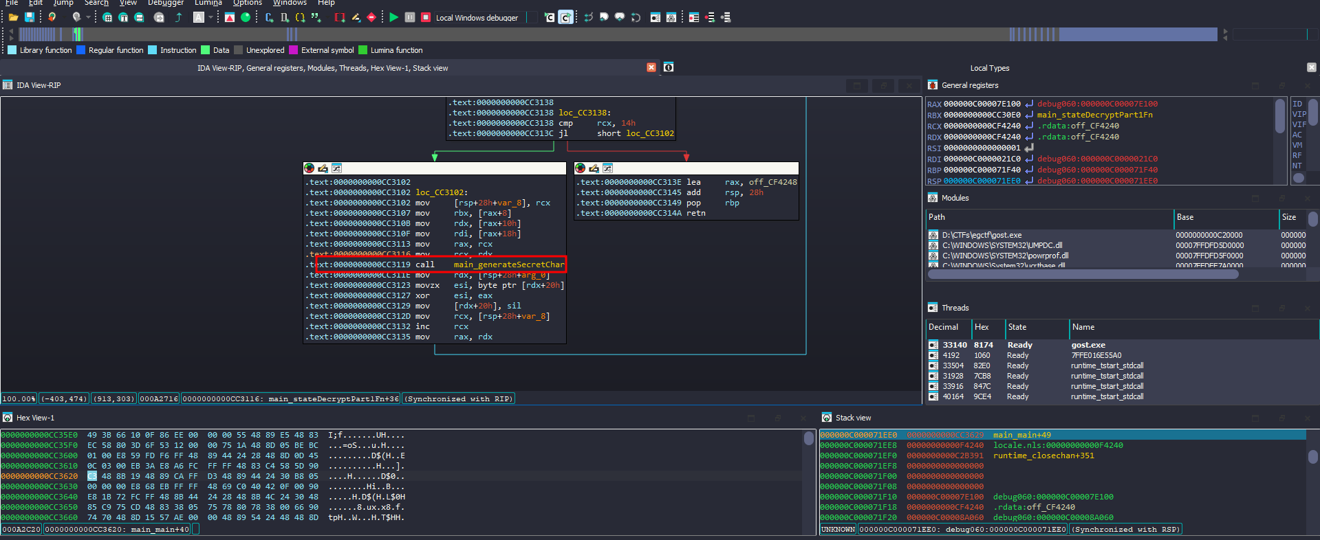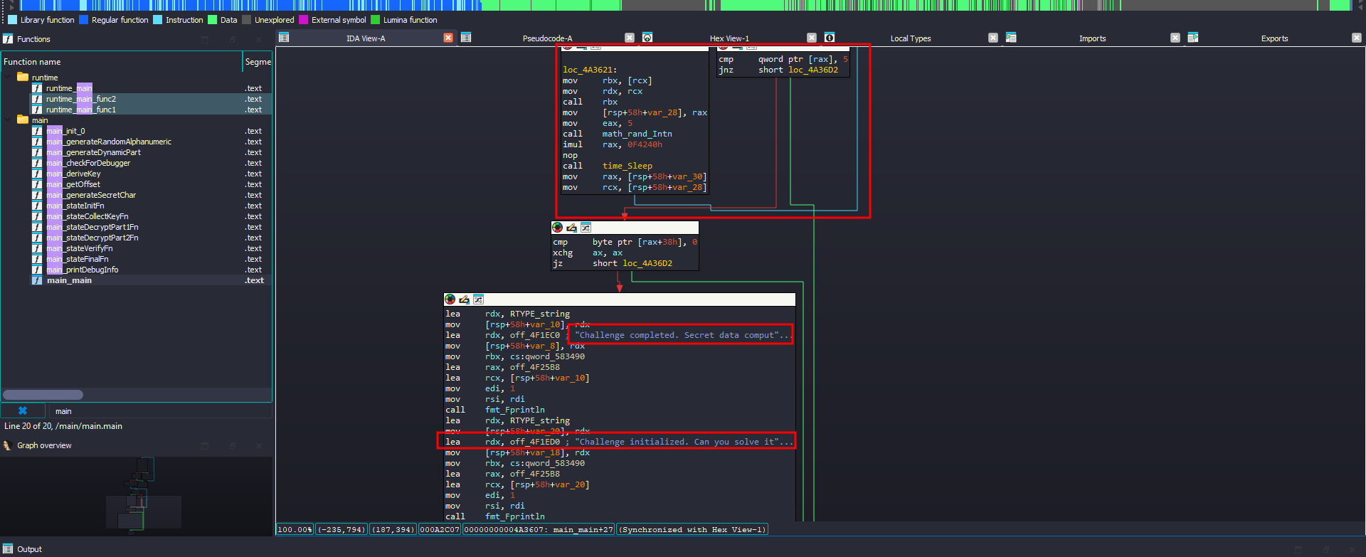 The one named main_stateDecryptPart1Fn grabbed my interset, so I stepped into and noticed that it generates secret characters