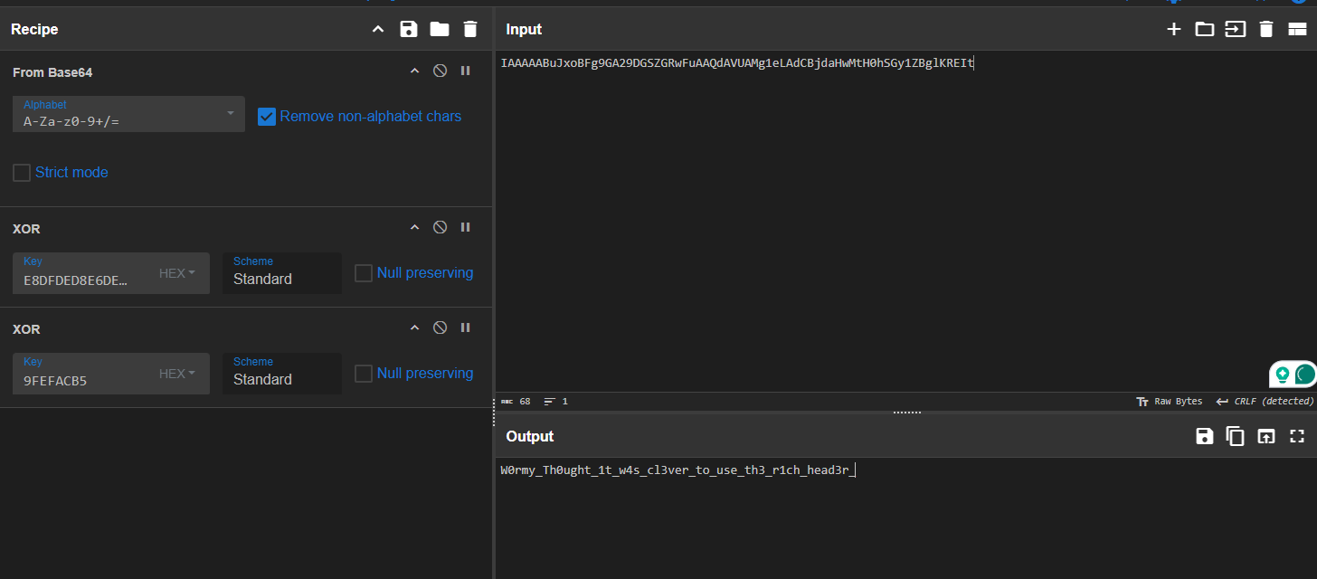 EGCTF{W0rmy_Th0ught_1t_w4s_cl3ver_to_use_th3_r1ch_head3r_VO190-k%#9MWX}