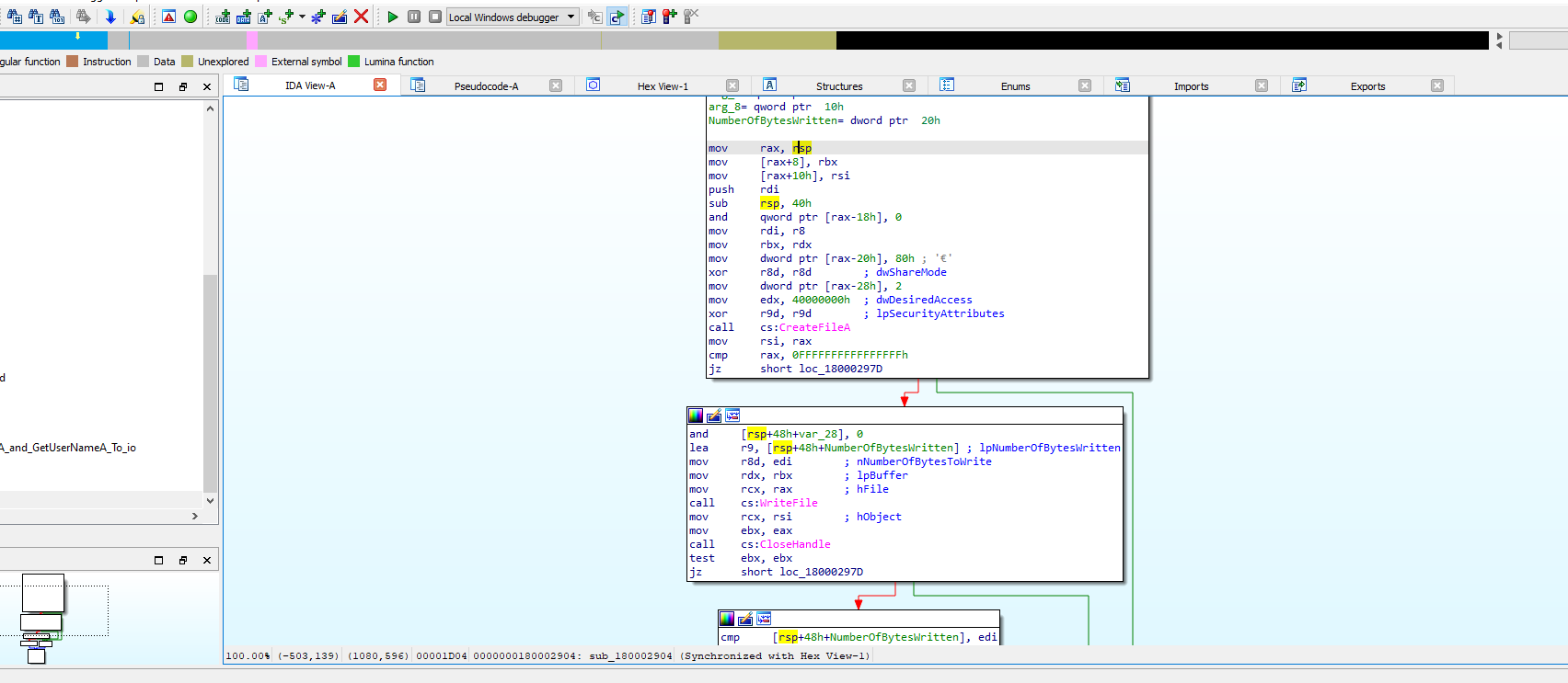 As the server is down, we can’t take the proper jump, which from static analysis we know is responsible for writing a file to the system in c:\\ProgramData\\, which will probably be the second stage of the malware downloaded from the C2 server.