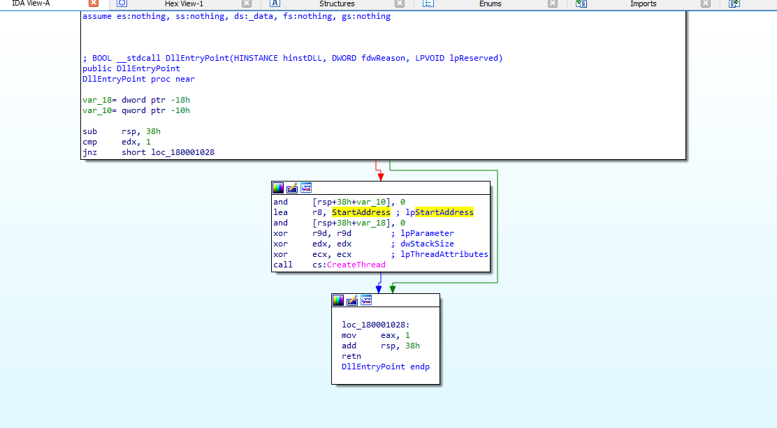 At first glance, the dropped file is a DLL that calls CreateThread with a StartAddress as a parameter, which contains the functionality of the malware.