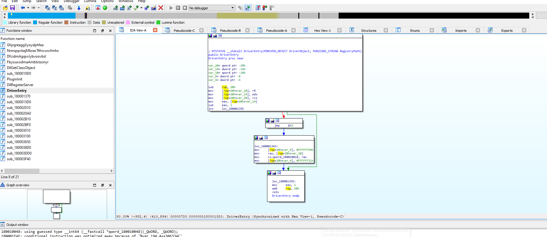 DriverEntryfunction decrypts an embedded executable, which is subsequently dropped and executed.