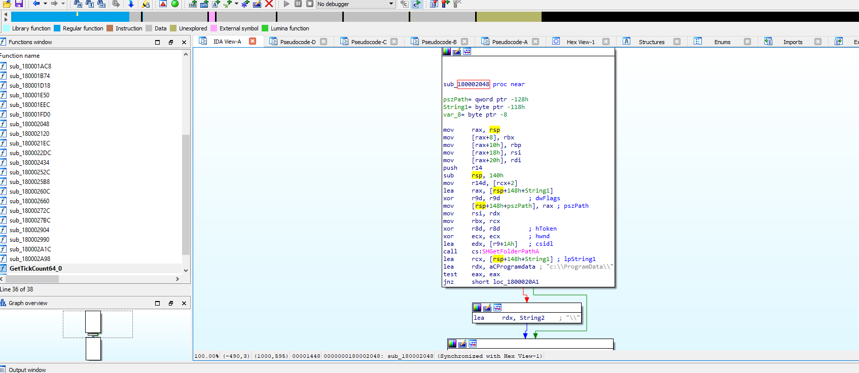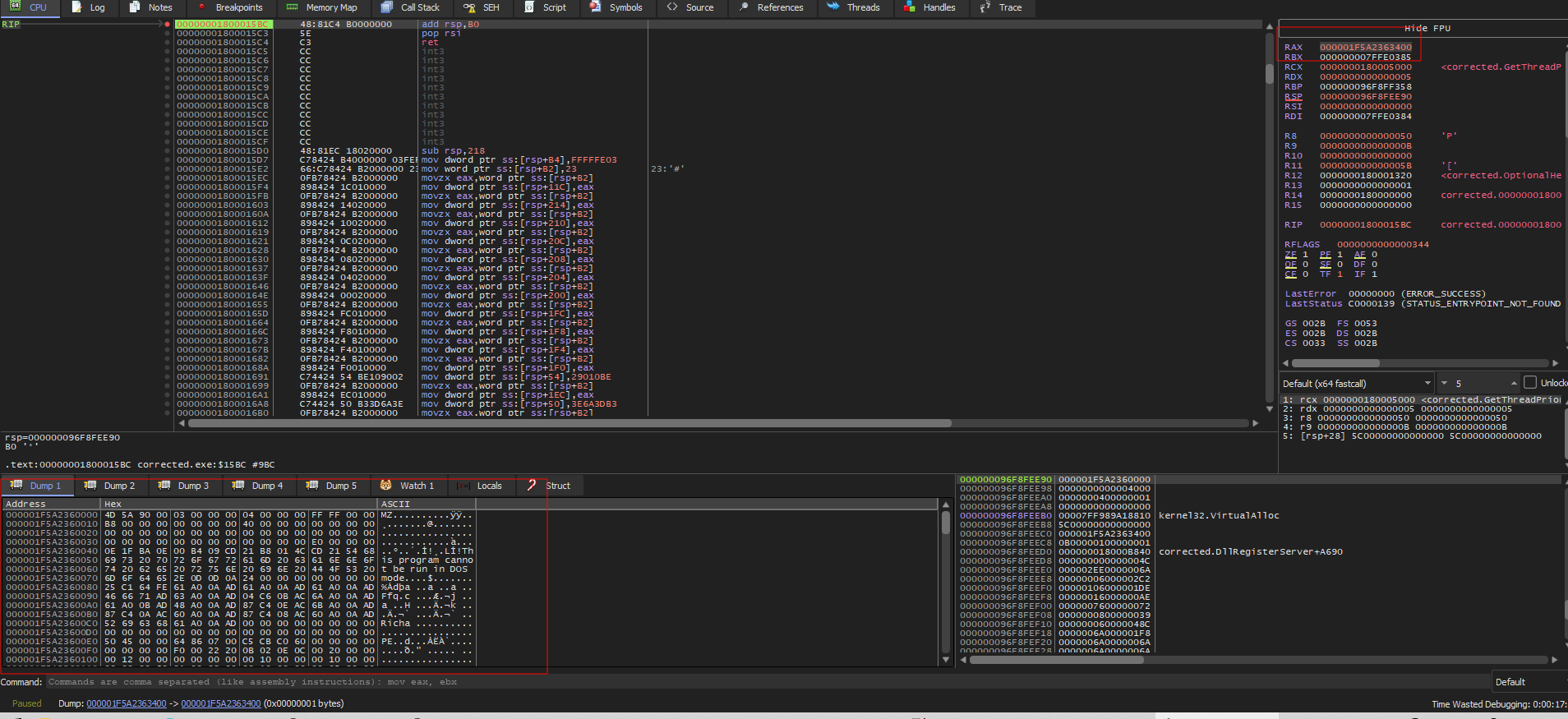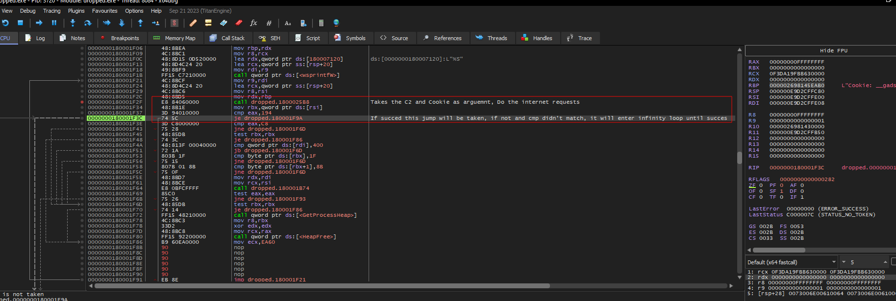 As the server is down, we can’t take the proper jump, which from static analysis we know is responsible for writing a file to the system in c:\\ProgramData\\, which will probably be the second stage of the malware downloaded from the C2 server.