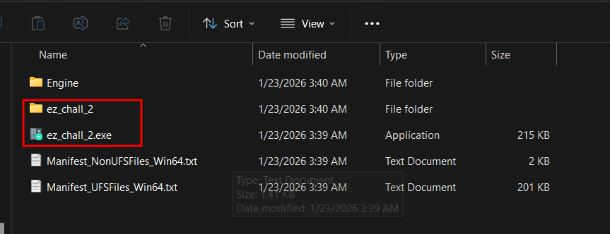 For my challenge I have the core logic made in standard C++, and all the code is compiled inside Binaries/Win64/ez_chall_2-Win64-Shipping.exe. This is standard for all Unreal Engine games to have the real exe in this format.