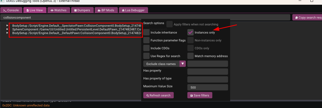 CollisionComponent. We want to filter for Object Instances only (uncheck the other boxes) because we want to modify the specific player currently spawned in the level, not the class template (CDO).Select the Component: You might see results for