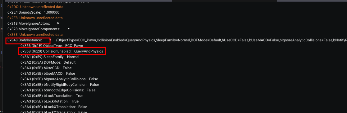 BodyInstancestruct property and expand it. Inside, look forCollisionEnabled.Currently, it is set to