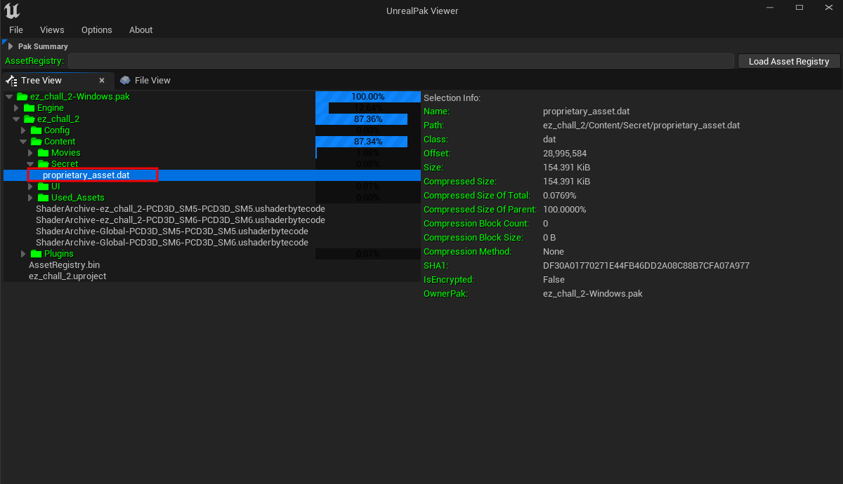 With the encryption key in hand, we can use a viewer tool to inspect the contents of the .pak file. A reliable choice is UnrealPakViewer.