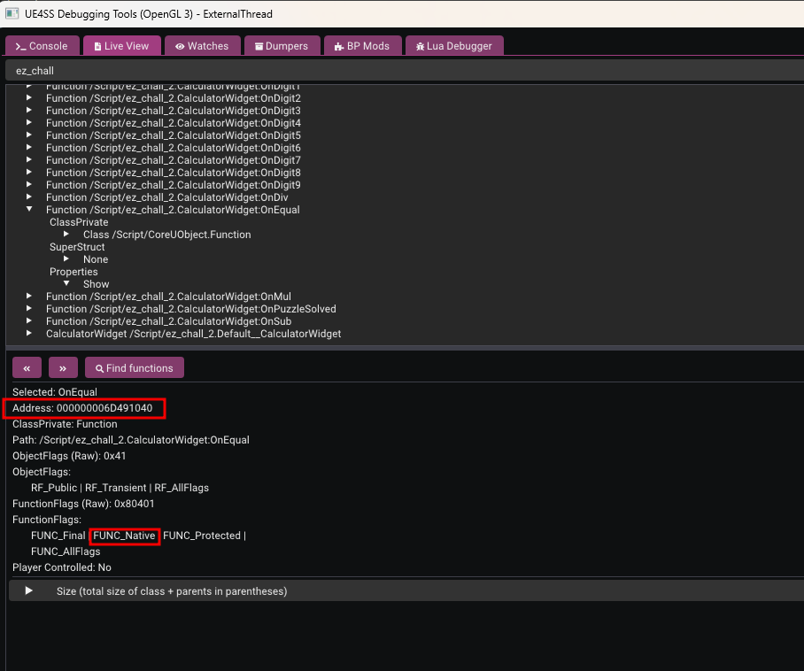 Clicking on any one shows the address of the function and also tells us its type (native or blueprint as example)