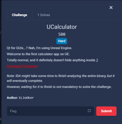 For this edition, I had the opportunity to craft a unique Reverse Engineering challenge: UCalculator, which got only 1 solve during the 48 hours of the competition. It is likely the first challenge of its kind in the CTF scene, designed specifically as an introduction to Reverse Engineering Unreal Engine 5 Games.