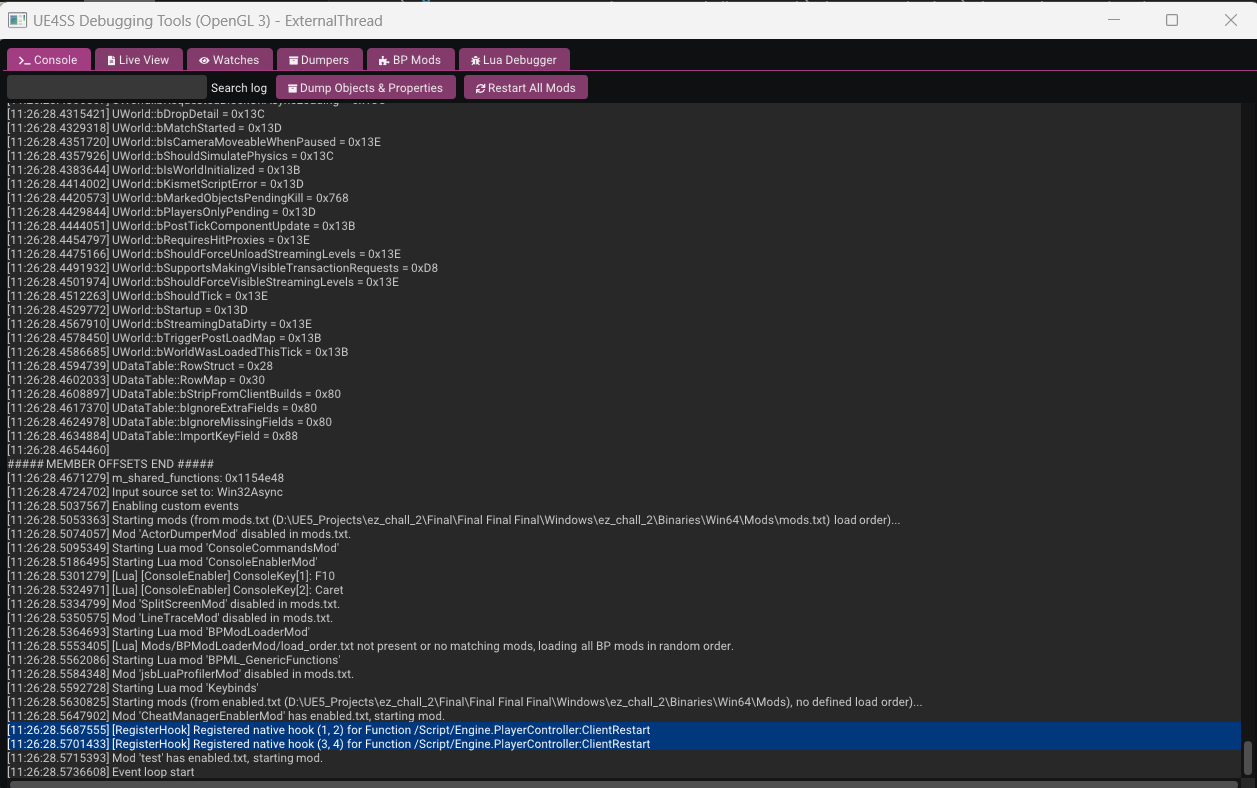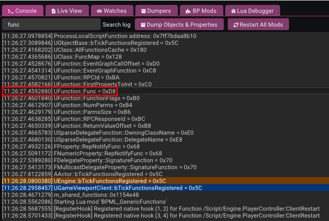 so, do you remember the Console tab we glanced at earlier? This is where it becomes crucial. UE4SS conveniently reports the Func offset during initialization. In this version of the engine, the offset is reported as 0xD8.