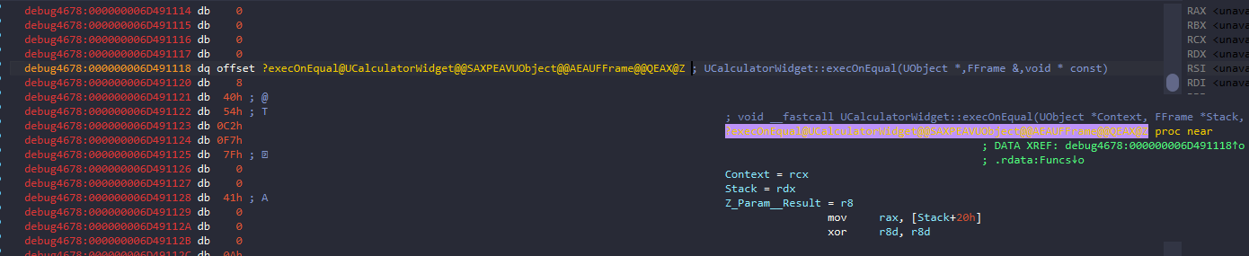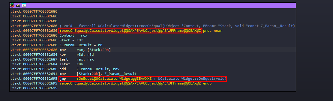 In the SDK or property dump, this is often at a specific offset (e.g., 0xE0). If we view the memory of this UFunction object in IDA or a memory viewer, we will see a pointer further down that points to the .text section (the executable code). That is where the logic for OnEqual actually lives.